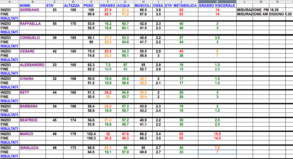 Per Giordano e Marco, con struttura corporea Kapha (piu’ robusta), che avevano e hanno ancora 14 e 14.5 di grasso viscerale e 28 e 30.2 di grasso corporeo serve piu’ tempo… ci vorrebbero almeno altre quattro settimane di pratica intensa per poter iniziare ad ottenere ottimi risultati. Per Consuelo, Cesare, Barbara e Gianluca di costituzione “Pitta-Vata” c’e’ stato invece gia’ un buon calo di grasso corporeo e viscerale – esattamente di un punto – abbassando cosi’ notevolmente l’eta’ metabolica.