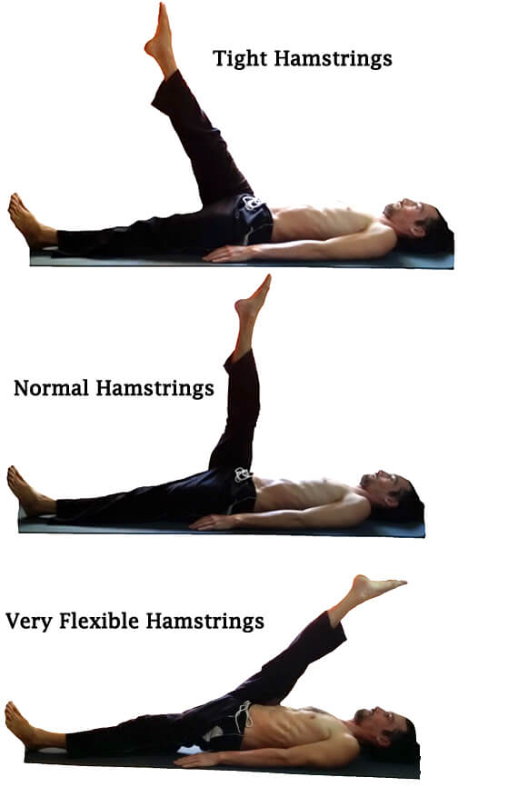 Tuttavia, se il gamba sollevata costituisce meno di un angolo di 90 gradi rispetto al piano, (ad esempio un angolo di 60 gradi, 45 gradi o anche 30 gradi rispetto al pavimento) i muscoli posteriori della coscia e i tendini del ginocchio sono decisamenti accorciati.